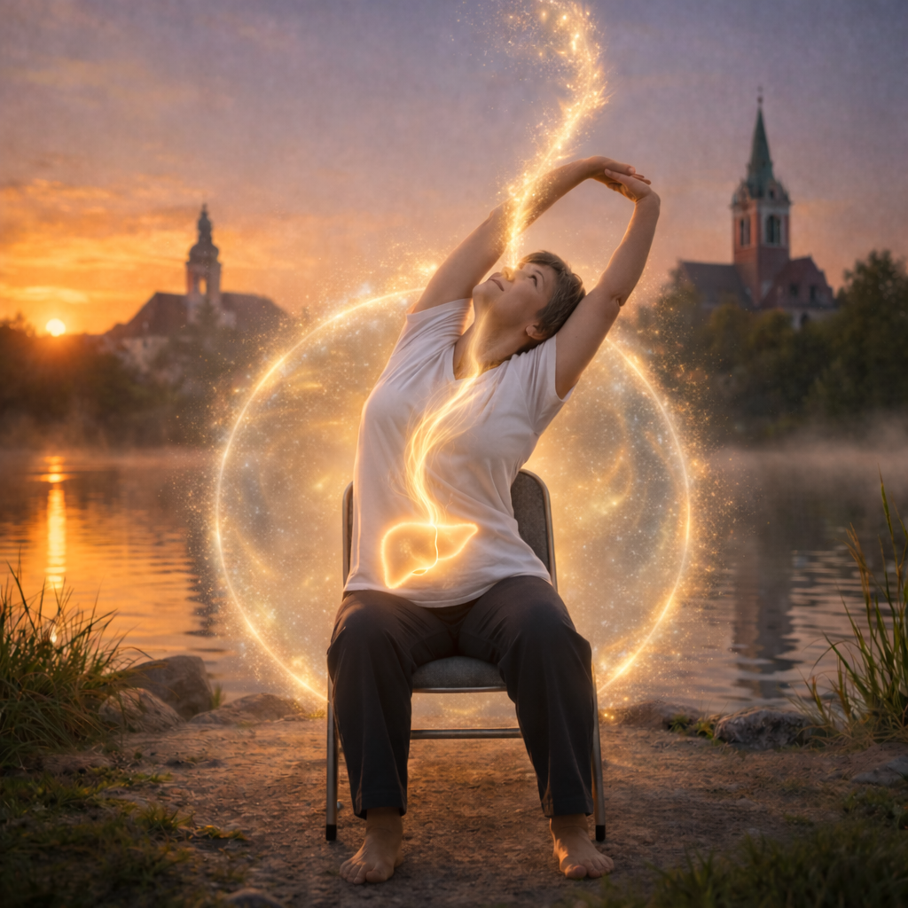 - A kilégzés befejeztével nyissuk szét ujjainkat, és a tenyér tövének kifelé nyomásával lassan engedjük le a kezünket. Lélegezzünk be lassan a májba, és képzeljük el a ragyogó zöld energiát, amely jósággal tölti el a májat.
