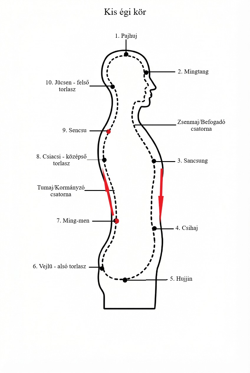 - Hujjin/HuiYin/Befogadó 1-es pont, a gát területén, ez a kör legalsó pontja, innen felfelé indul a test hátsó oldalán a gerinc vonalában